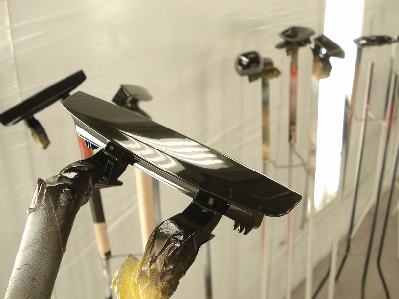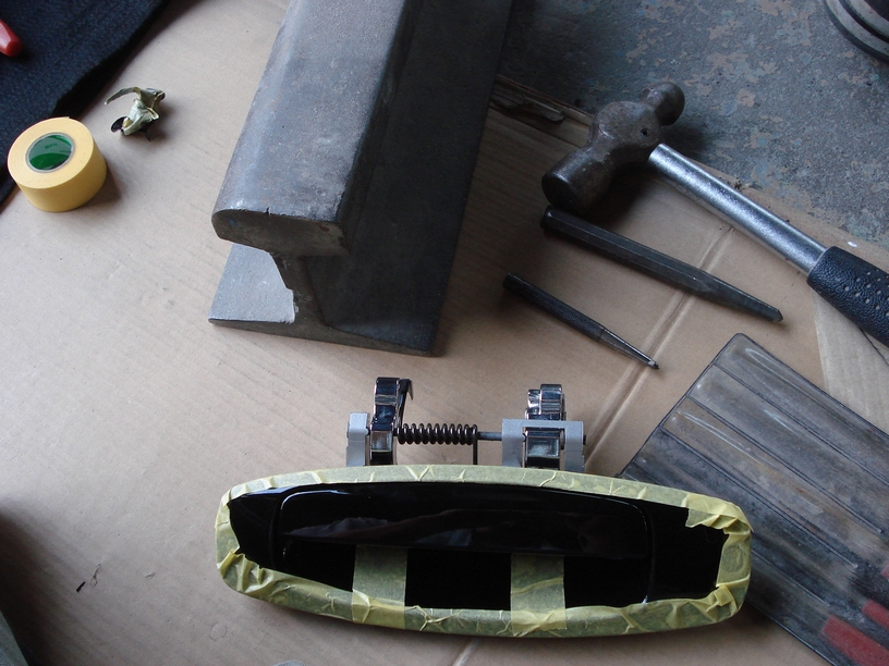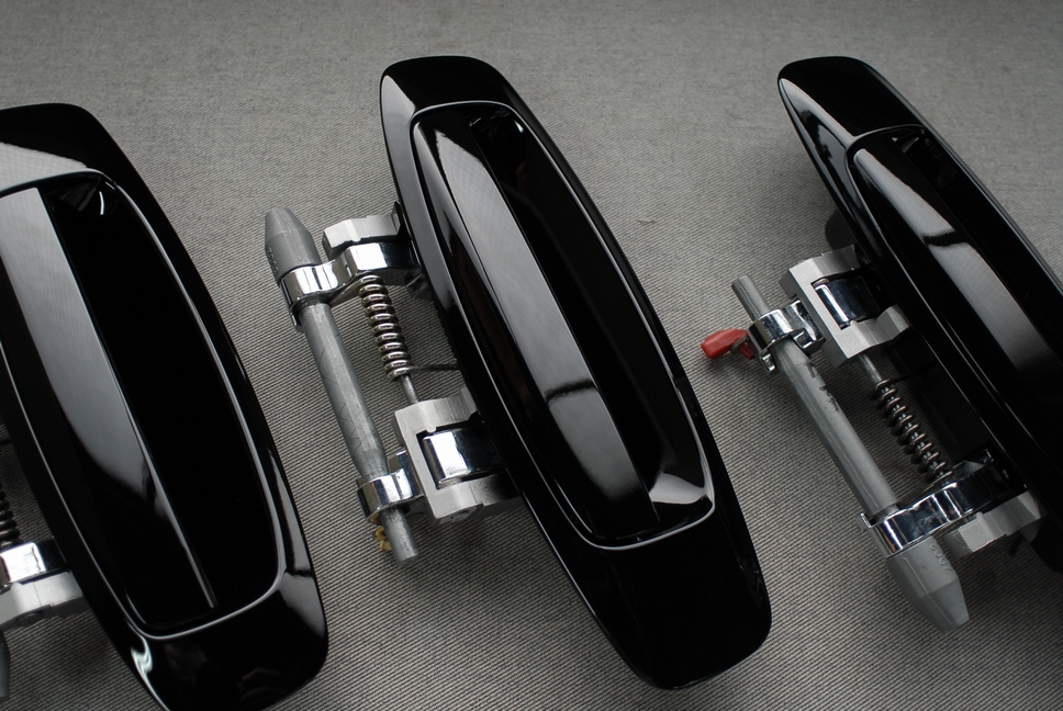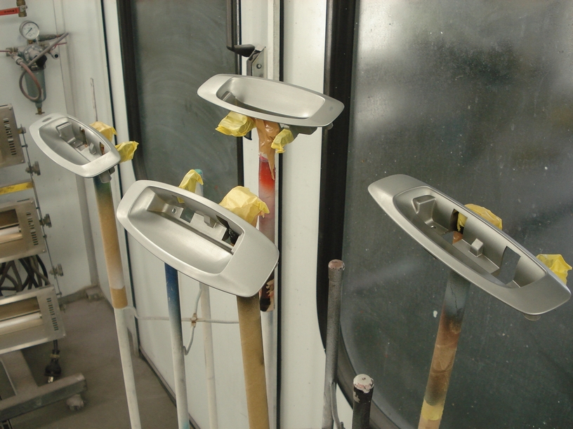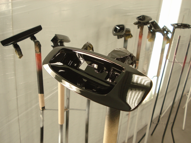 これはアウターハンドルの「取っ手」の部分です。元々はメッキが掛かっているのでそのまま塗っても剥がれ易いですからメッキ用の下地処理を施しています。