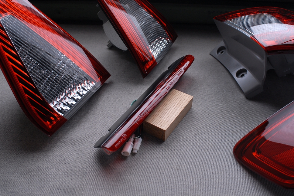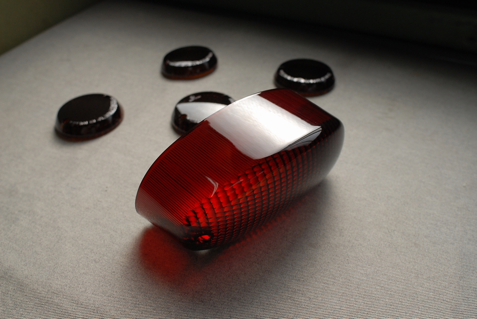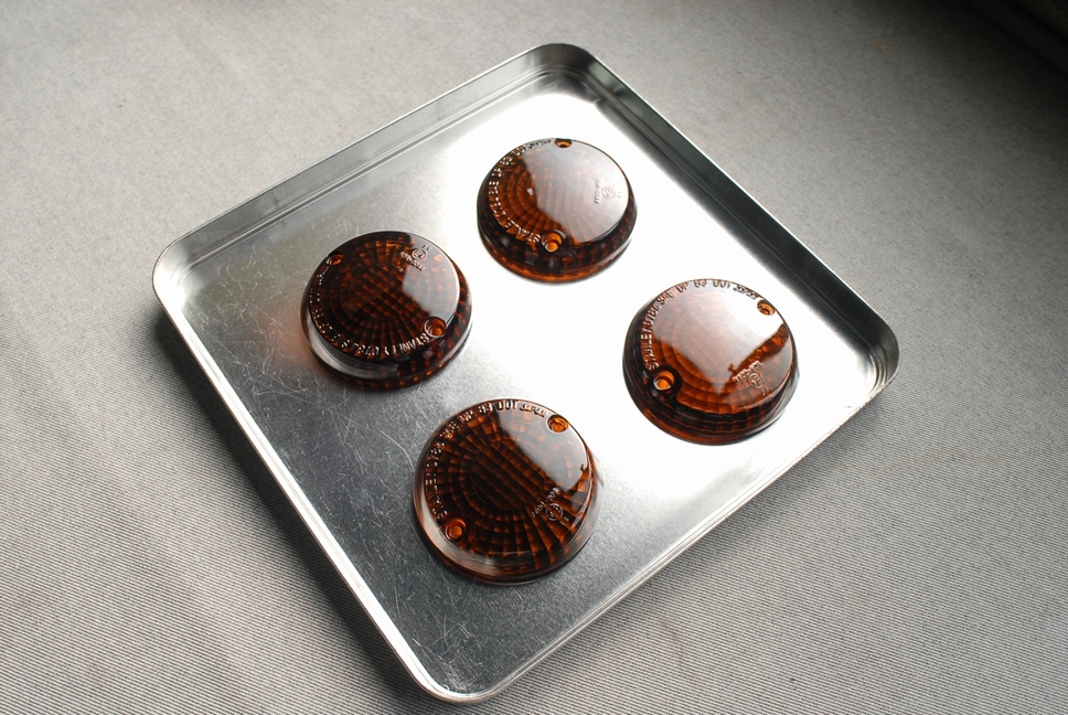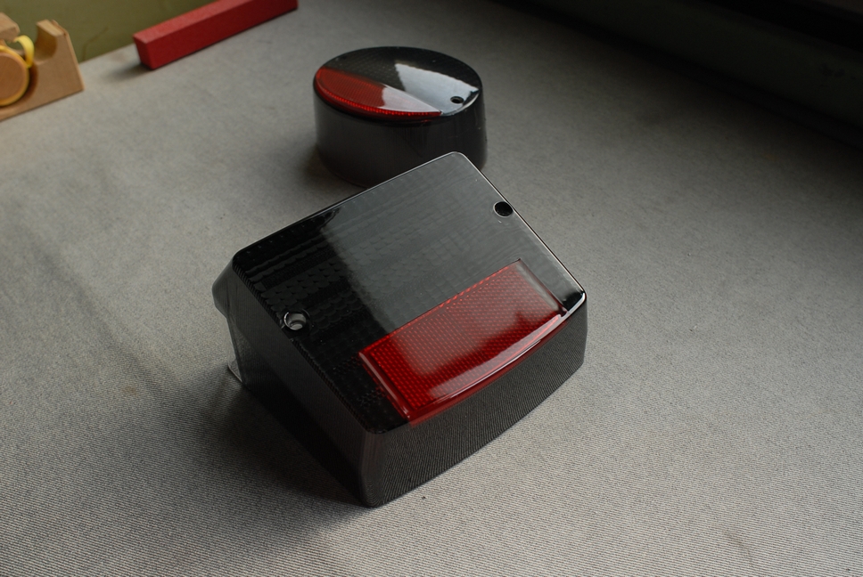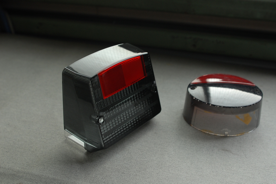 手前の大きいのがテールレンズで、レンズ単体だと反射板が無いので真っ黒に見えてしまいますから横にして撮影しています。実際にはもう少しKく見えますのでご安心下さい(この見た目だと「薄目」ですかね)。
