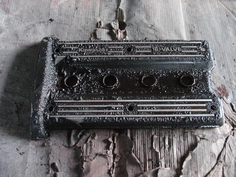 元々はガンメタの半艶で御依頼頂いていたのですが、アルミ表面の腐食が酷くそれを平滑な下地に造り直すくらいなら結晶塗装にした方が費用は安く恰好良いのでは、と言う事でこちらの結晶塗装で御依頼頂く事になりました。オリジナルでは無くなってしまいましたが恰好良いですよね。そもそもお客様の物では無く社長さんのバイクの物らしいですし(笑)。