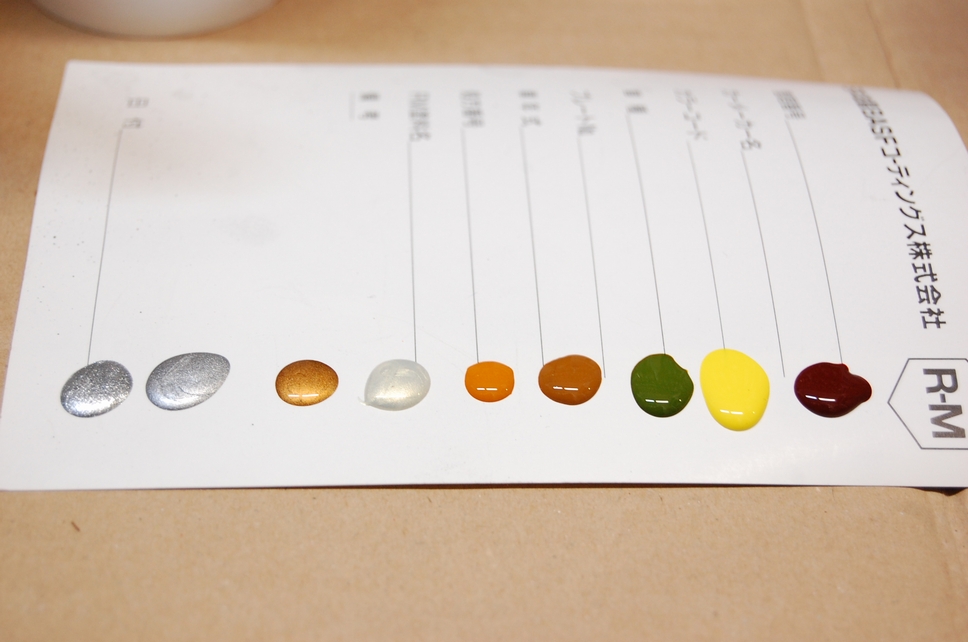 と言うことで、今回のベースカラーは「ゴールドメタリック」ですから、色見本帳から選んで頂いたゴールドに合わせて色を作ります。早速先日小分けボトルに詰め込んだ原色を利用しています。 詳しくは昨日の社外記へどうぞ。