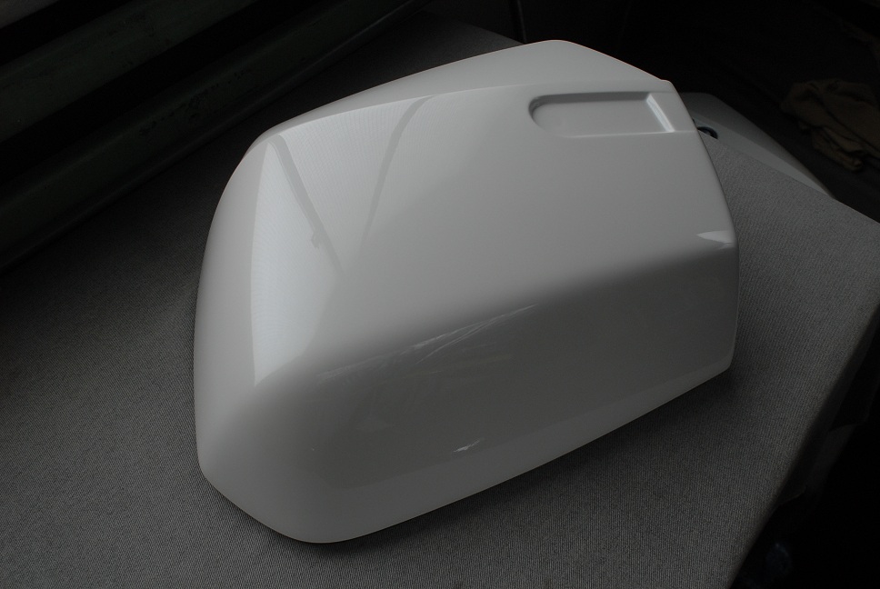 大変お待たせしました!梨地だったパニアケースの蓋は艶々のホワイトパールで無事完成となります。