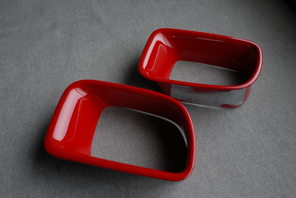 今回のご依頼では、外装部品であるバンパーマウス(グリル)とフォググリルはボディ同色の「カーボングレーマイカ」の艶有りで、内装についてはこれとは全然関係なく「レッドキャンディー」で承っております。ソリッドカラーやパールではなくキャンディーカラーの美しさに惹かれているようですね。解ります解ります(笑)。
