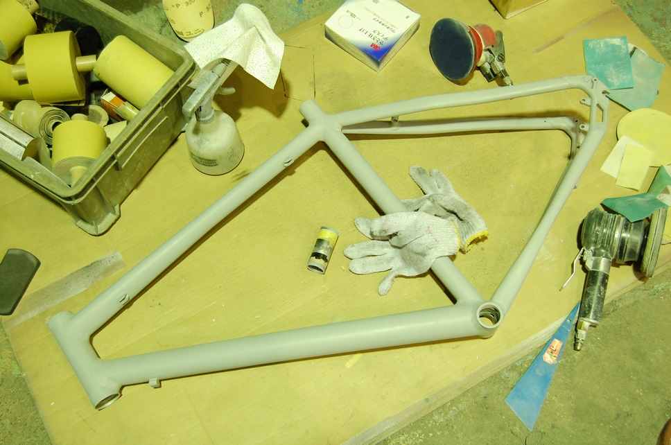 こちらもお待たせしております。キャノンデールのアルミフレームですね。サフェーサーを研いで本塗りの準備を行います。