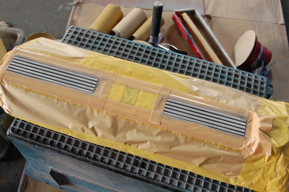 そしてこんな感じでマスキング作業が完了です。直線だから良かったですが曲線だとちょっと難しいですね。結晶塗装は表面が凸凹状になっているのでマスキングテープが貼り難いのです。もちろん今回はそれを想定しての作業ですからご安心ください。