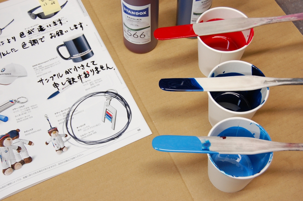 丁度TACさんに入庫したBMWにこのエンブレムが付いていましたから、これを見本として色を作成しようと思って確認してみたのですがどうもこのシールは怪しいです。車体はまだ新しいようですがシールに印刷されている色、特に赤は既に褪色したような色になっています。こんなんで良いんですかね…。