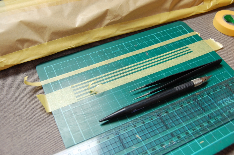 ただ2mmのマスキングテープというと「ラインテープ」しかないので、しかしこのテープだとコシがあり過ぎて今回ような「直角折り曲げ」箇所への貼り付けは浮き上がってしまいますから、このような場合には既存の薄い紙タイプのマスキングテープをカットして1.2ミリ〜1.6ミリくらいの幅のテープを作成します。模型塗装ではよくやる方法ですね。