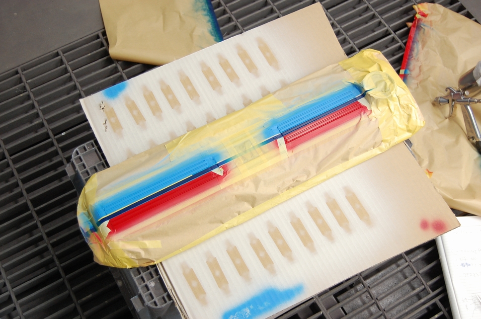 こんな感じでベースコートは終了です。この状態だと色が周りに食み出てますから統合性が無いというか「本当に大丈夫か?」といった感じですが、マスキングを剥がしたら回りは黒ですからきっとこの3色のラインは映えますよ。