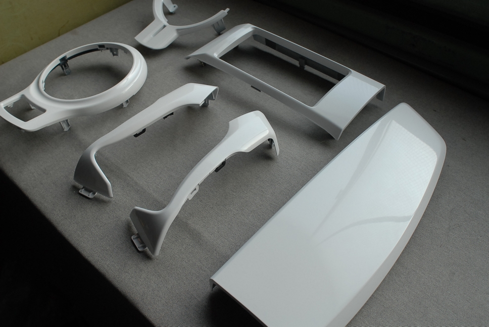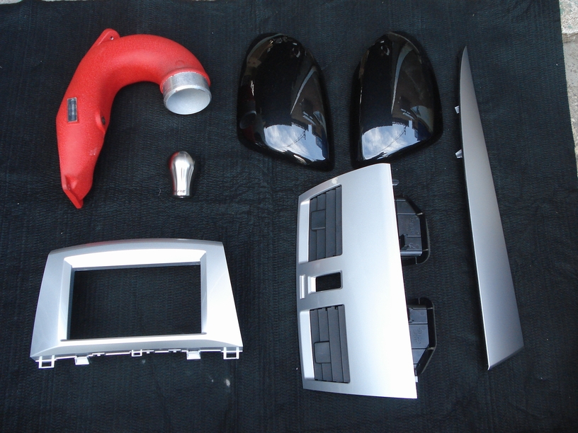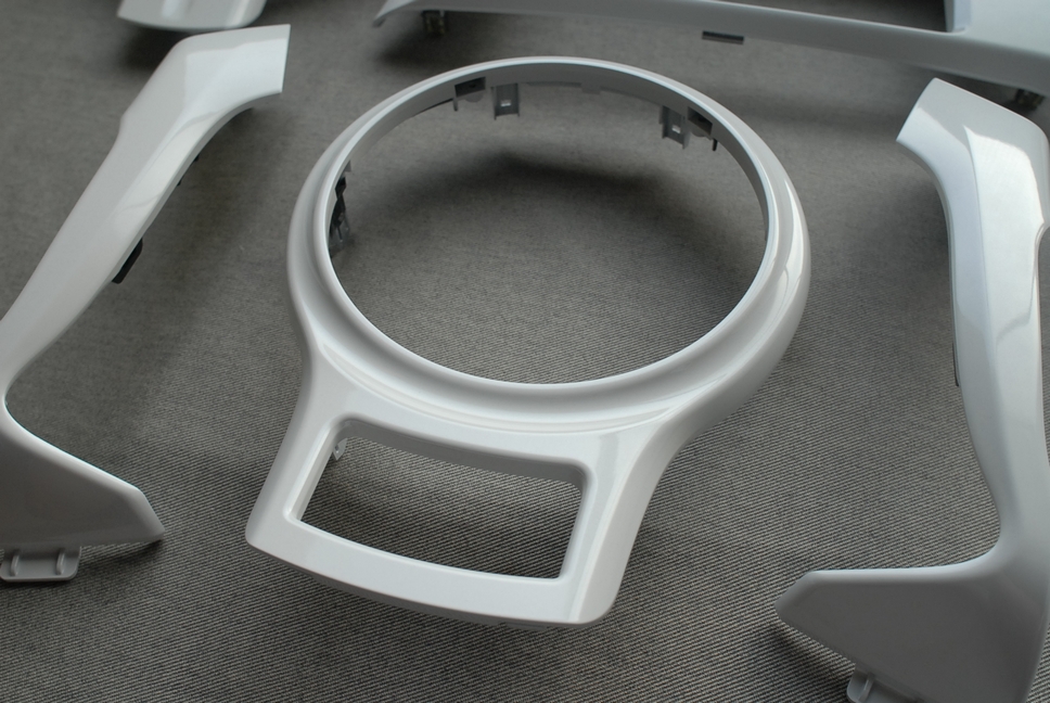 画像はスバルBRZの内装パーツ一式で、黒い樹脂パーツやらシルバーに塗装済みのやら全てをホワイトパールで塗り直します。