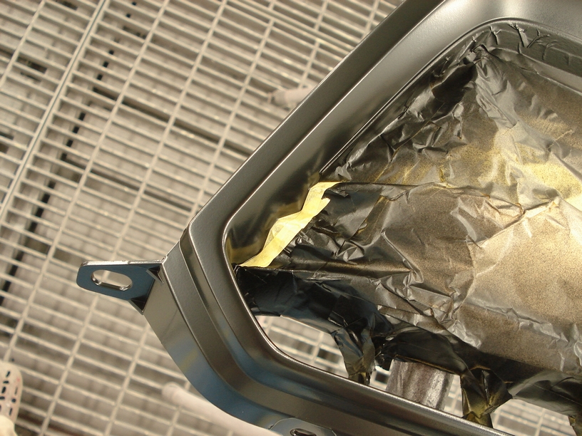 画像はベースコートの黒を塗り終わった状態で、一部元の色(シルバー)が食み出ていた箇所をマスキングし直しています。クリアーは谷のラインで見切るようにして極力目立たない仕上がりにする為です。