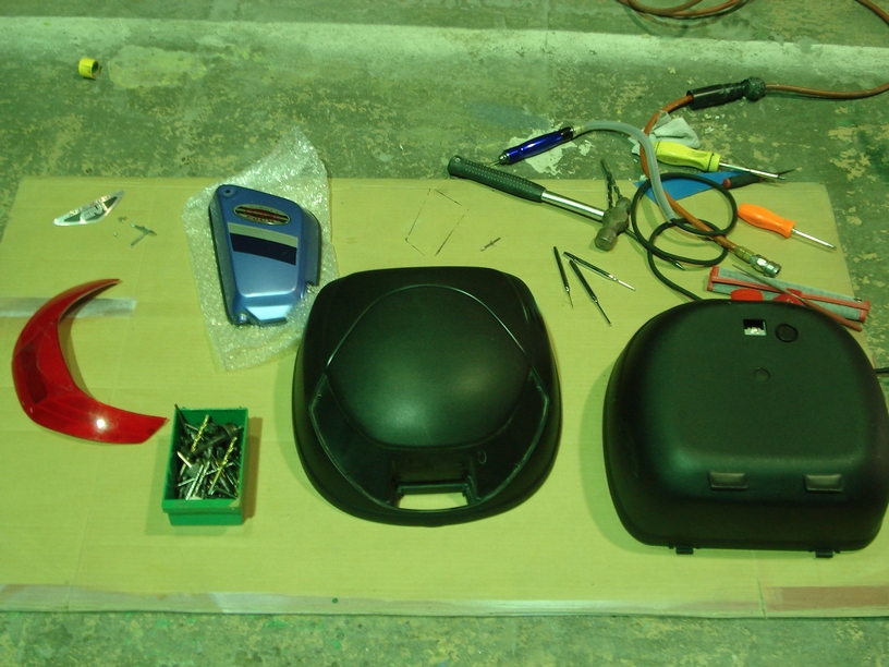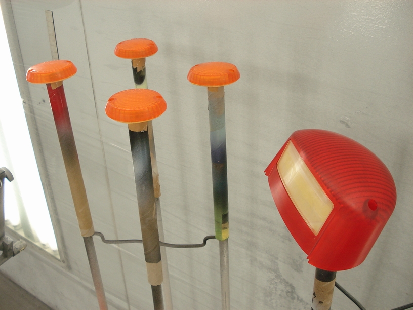 向こうにあるのは段ボールで作った「台」です。 三角型のテールランプはそれ自体だと自立しないのでこの枠に乗せて塗っています。 非常にアナログ的な手法ですが、毎回同じ物を塗っている訳では無いのでその都度何でも対応出来るようなやり方がが必要なのですが、むしろこのお蔭で飽きずに仕事が続けられているのかも知れません(笑)。