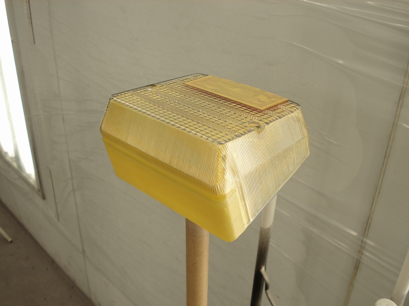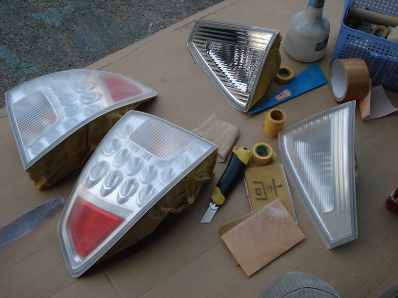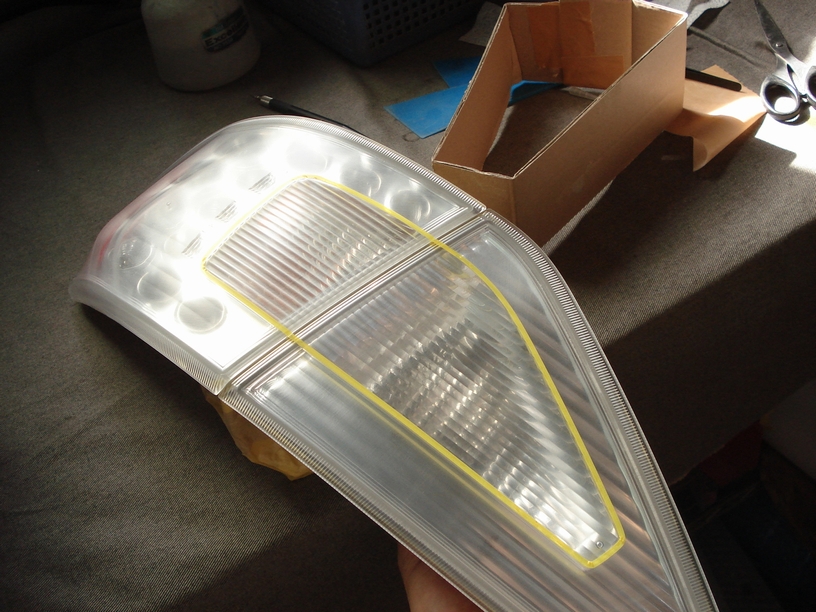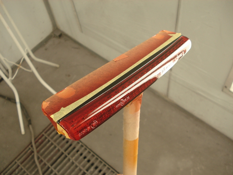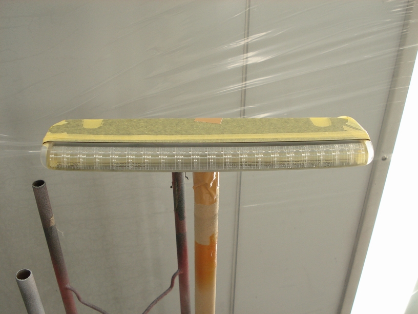 上の面でマスキングしている箇所は反射板になるところで、ここは先日「レッドキャンディー」で塗装し、レンズ全体にはクリアーを塗布済みです。