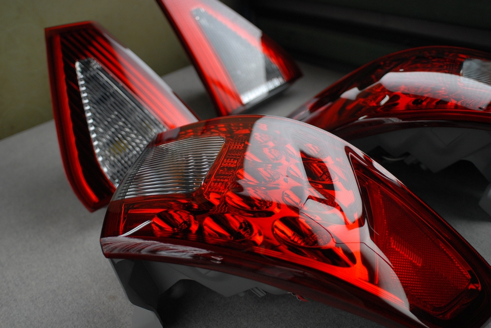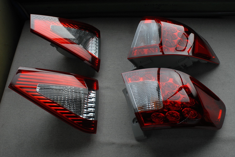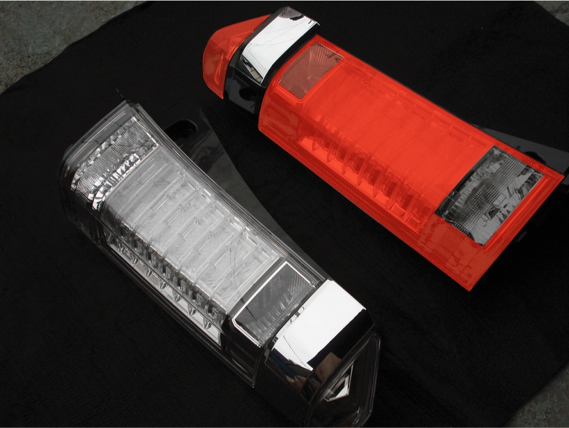 御依頼の理由としては、以前同型のテールランプを御依頼頂いた時のオーナー様と同様、純正のレッドの部分が朱色っぽく、クリアーレンズの部分も妙に安っぽいので若干のスモークを掛けて落ち着いた感じと高級感を出せれば、といった感じです。以前御依頼頂いた時のオーナー様は「この紅白おめでたい感じを払拭したい」と言っておられましたが確かにそんな感じです。