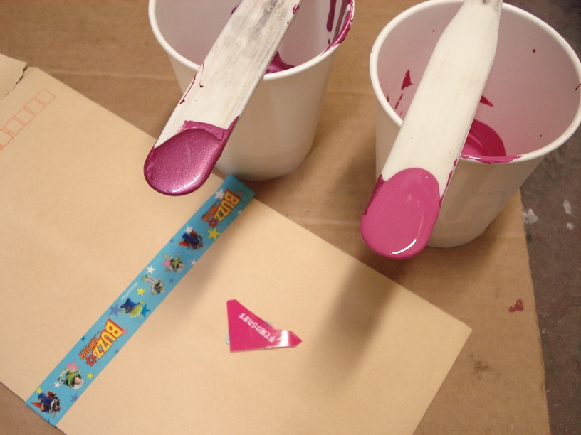 使っている原色はマゼンタ系が2色で、左側がそれに「メタリック」を入れた物で右側が「ホワイト」を入れた色になります。当然全然違う色です。