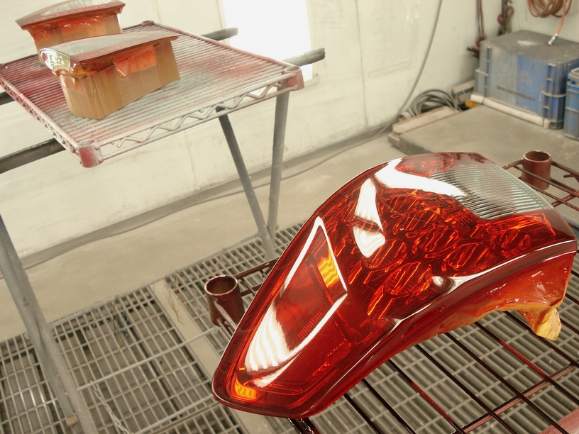 いつものインプレッサなどのテールランプでは「最後に全体にスモークを薄く掛ける」と言う事で一工程で終わるようになっていますが、今回はレッドとスモークをそれぞれ分けて塗らないとなりませんので二工程分(二個分)の塗装が必要となります。当然費用も倍近いのでこれ一つで2万円を越えます…。