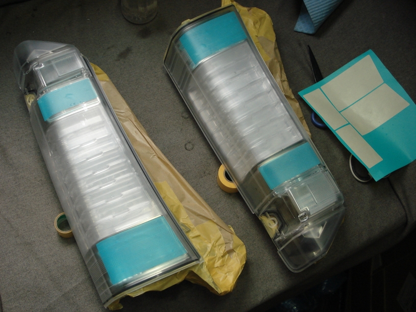 この型のテールランプは以前「極薄め〜薄めの間」のスモーク塗装で施工した事がありますが、今回は「レッドキャンディー」をベースに、ウィンカーとバックランプ部分をクリアーで抜き、そして最後に薄めのスモークを全体に塗ります。 ただウィンカー部分に関しては「クリアー」と言うよりは他の部分と同程度の「レッドキャンディー」になるようにします。コート数を減らして赤を薄めにする感じです。