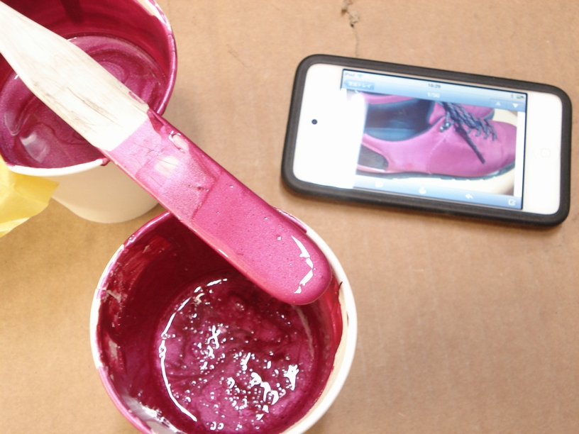 オーナー様のご希望としては、画像のiPodの画面に写っているスニーカーの色でして、また当店で以前塗装したスターバックスのタンブラーもイメージに近いとの事です。オーナー様がネットで参考になる物を探して「これだ!」と思ったら実はうちが塗った物だったって奇跡的な事が起きたらしいです…。