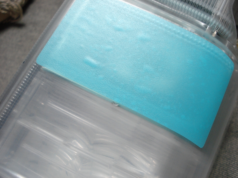 一般的な塗料は「顔料」で構成されているのに対して、今回のような着色樹脂であるプラスチックのキャップは「染料」が使われているのでは?と思います。なので今回も最初の調色の時点ではこのキャップのような鮮やかな水色は表現出来ませんでした。どうやっても既存のボトル部分に塗られていたような濁った水色になってしまうのです。 ただこの水色もそれ単体で見ていればそんなに濁っているようには見えないので、当初はそこまで調色が難しい(と言うか既存の塗料では無理かと…)とは思わなかったのですが、いざ調色してみるとどうしてボトルの色があんなに違うのかの理由が解りました。私もまだまだ相当未熟なようです(苦)。