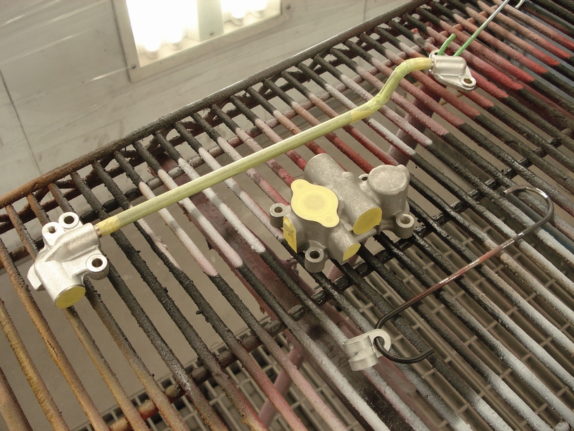 先日サンドブラストまで処理しておいたのでその後にリン酸処理を行い、綺麗な水で良く洗い流したらよく乾燥させてマスキングを行い、いよいよ本塗りとなります。