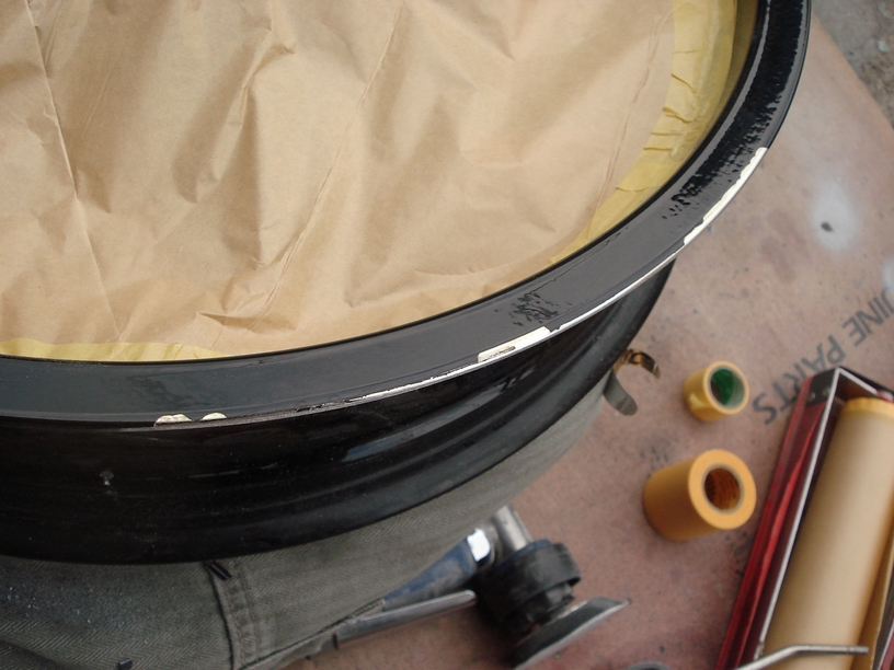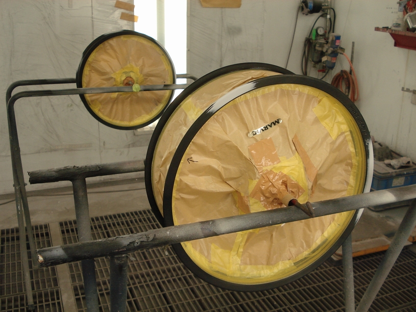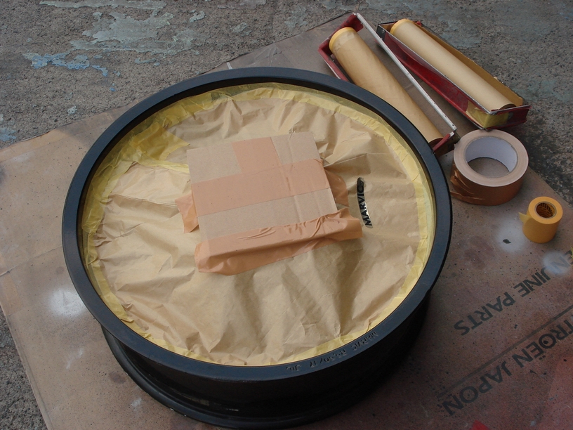 画像は作業前のマスキングで、今回塗るのはリムの部分だけですのでそれ以外の箇所は汚れないようにマスキングしておきます。