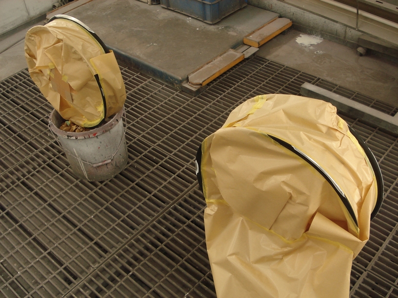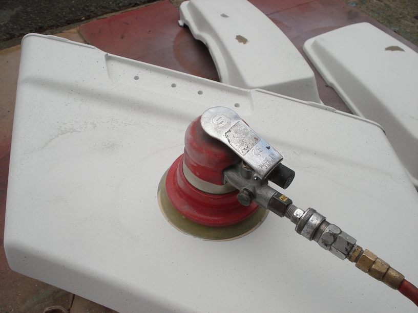 と言う事で、最初は#320のペーパーを貼ってダブルアクションサンダーでザクザクと削っていきます。空研ぎのデメリットはとにかく「研ぎ粉」が出るので、工場の外に段ボールを広げて作業しています。 最初の内は面倒なのでマスクもしないで作業していましたが、さすがに尋常じゃない粉塵の量になったで(危)途中からはちゃんと装着する事にしました。出来れば長く仕事は続けたいですからね…。
