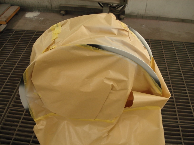 で、サフェ研ぎが終わったら最後に水を掛けてラインのチェックや深く入ったペーパー目の取りこぼしの処理を行い、いよいよ本塗りの準備です。裏側のマスキングはフチの部分は一旦全部剥がして貼り直します。