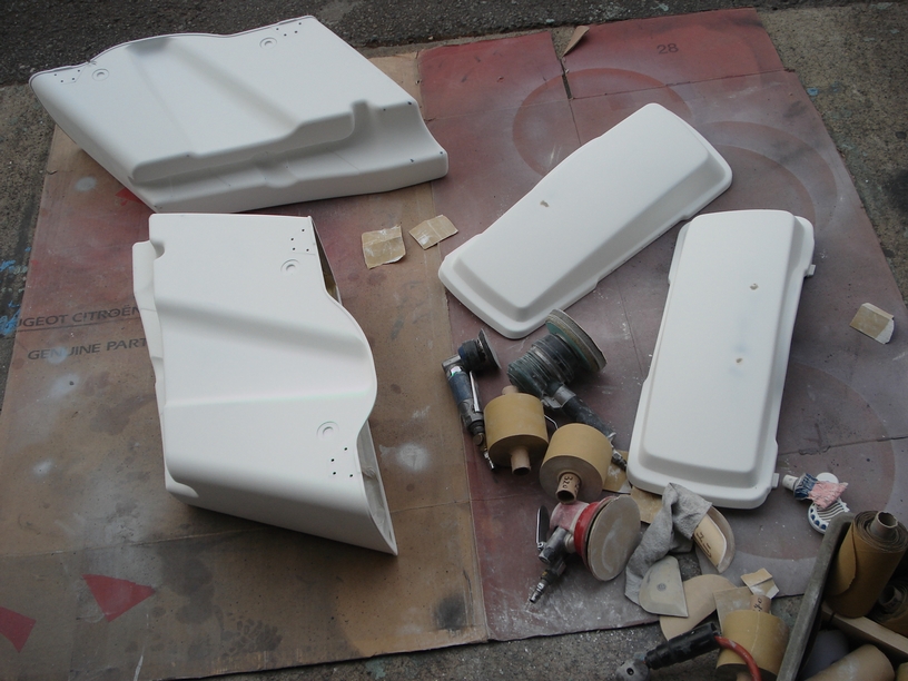 今回は下地の状態が「梨地」と言うわけでは無く一応は「フラット」な素地なのですが、ただそのままいきなり上塗り塗装を出来る状態ではありませんので、バリや飛び出た箇所は#120で平らに削り、#180→#240で表面全体を研磨します。平面はダブルアクションサンダーで、複雑なラインの箇所は手作業でネチネチと研ぎ続けます。