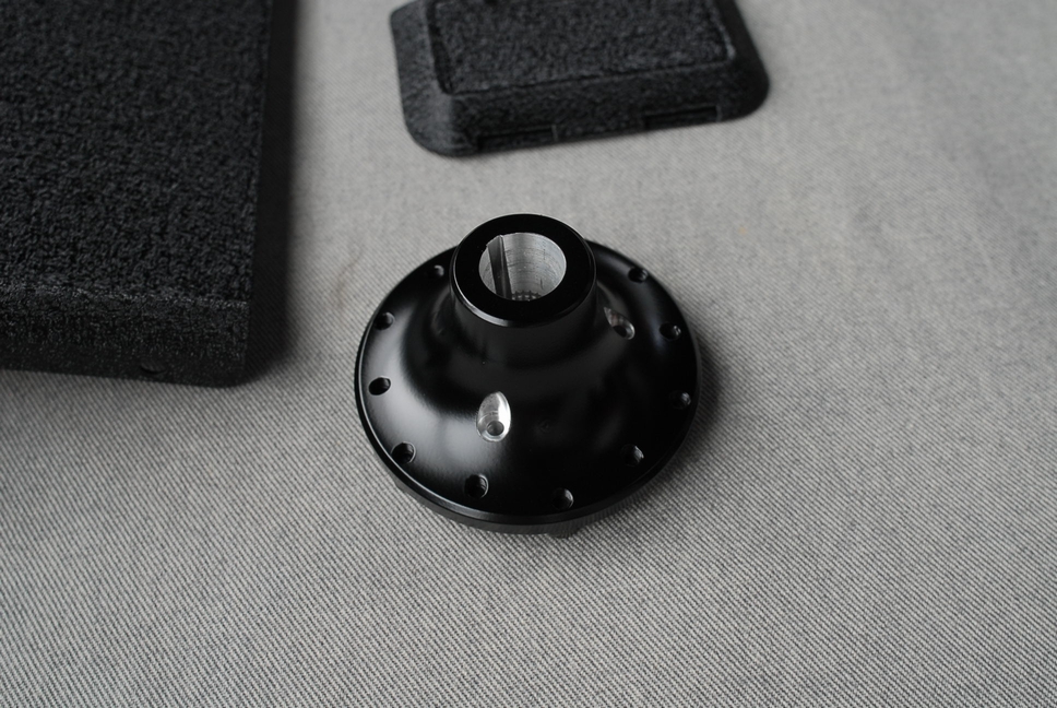 コンソールパネルとその蓋は「結晶塗装の黒」で、円盤のような形のステアリングボスは「半艶黒」(2コート塗装)で仕上げています。