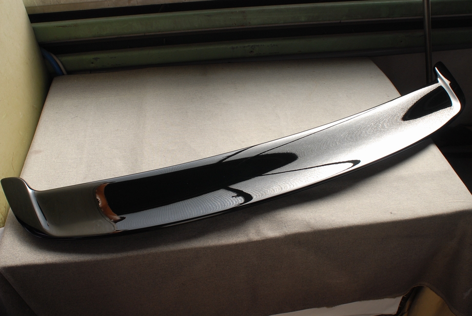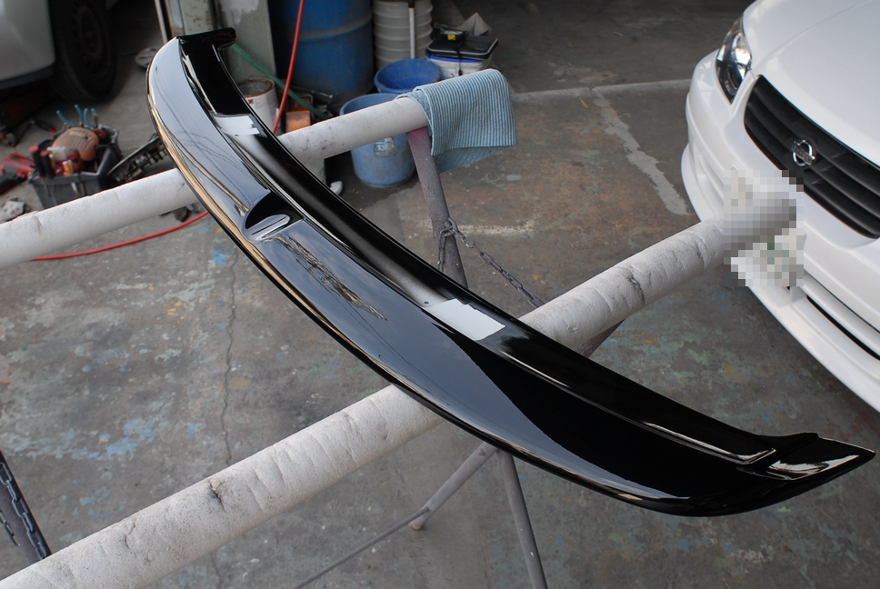 こちらはスポイラーの裏側です。一部が白くなっているのは色が塗られていない箇所で、これは塗る時の台座として板をテープで固定していたからです。この箇所は取り付ける時に両面テープ(と接着剤またはビス)が付いて見えなくなる所ですのでご安心下さいませ。