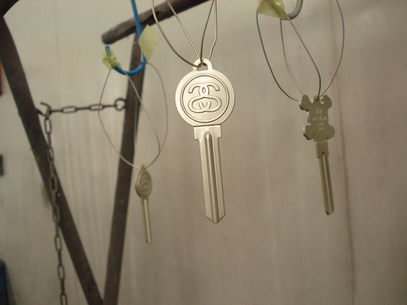 ちなみに一番左の鍵はブラストは掛けていません。元々塗ってあった塗装がかなりしっかりしていたので今回はこれは剥がさずにペーパーで足付け処理をして塗る予定です。無闇に塗装を剥がしてしまうよりもこの方が綺麗に仕上がると考えたからですね。手抜きではありませんのでご安心下さい(笑)。