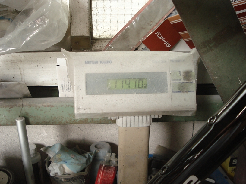 ・当店にやって来た時・・・1211.2グラム+削ったパテ分 ・新車時のメーカー公証重量・・・1115グラム ・完成した現在・・・1141.0グラム