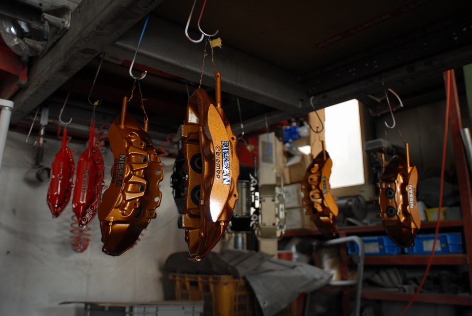 連休明けの仕事としては、例の如くブレーキ屋さんから頼まれていたキャリパーの塗装があったのでそれの作業となります。 手前のNISSANのシールは当店で作成した物では無くブレーキ屋さん(オーナーさん?)持ち込みの品です。 基本的にこういった持ち込みのシールは受け付けていませんが、納品直後に剥がれても構わない・ズレようが気泡がいくら入ろうが問題無いなどであれば小さい物であればお受付出来る場合もあります。勿論そんな感じですからお金も頂戴してません(苦笑)。