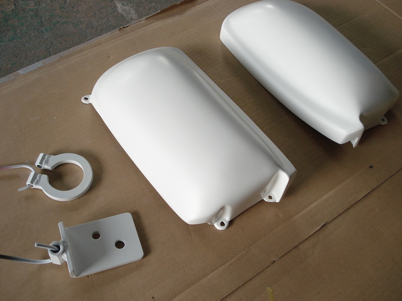 連休前に素地調整を行っていたハコスカのミラーカバー(FRP製)と牽引フックは無事サフェーサー塗布完了しております。