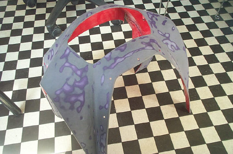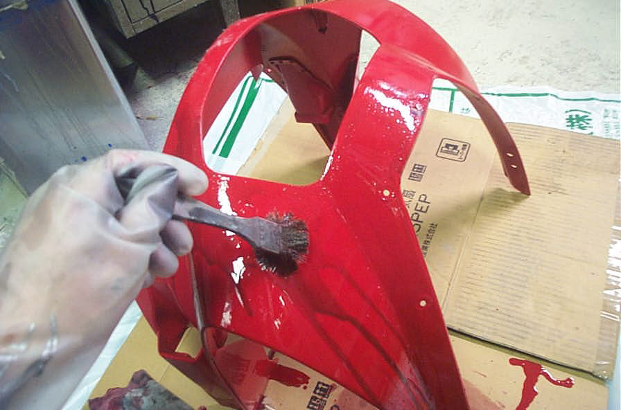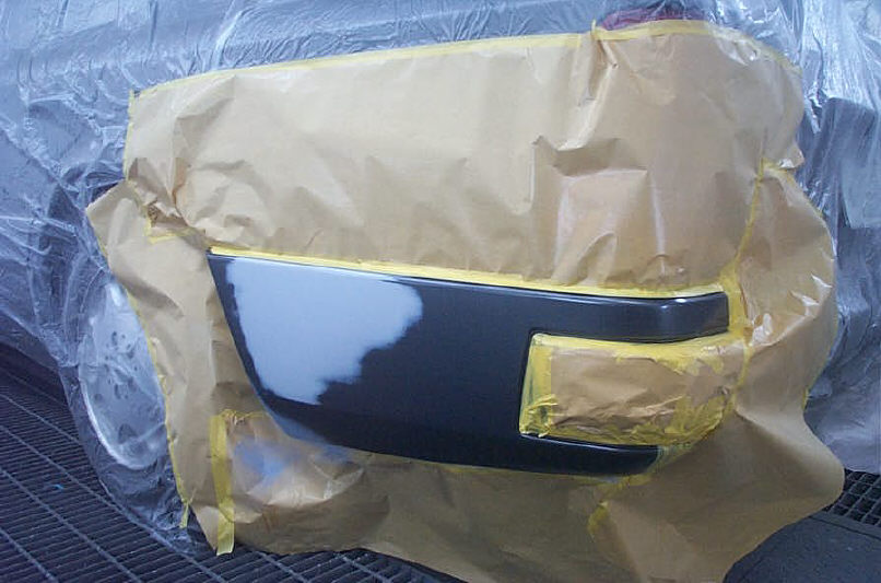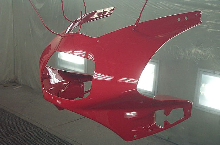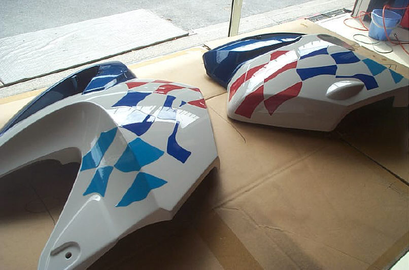 ベースコート自体は損傷部とその周りにボカシた程度で、範囲的には30cm四方くらいです。隣接するパネル(この場合フェーエルリッドパネル)との色違いが起こらない様に、その辺りにはベースコートは飛ばさないようにします。これは四輪車と同じ事になります。そして全体的にクリアーをパネル一枚塗って完成です。これも4輪車と変わりありません。 しかしバイクのカウルパネルの場合、地面に置いたりする事でカウルの角が削れている場合が良くあります(当店の場合、クッション材か作業台の上に置くので直接地面に置く事はありませんが) なのでそのような部分を一つずつ丁寧に拾って(塗って)いきます。表側に色を飛ばすと先に説明した「隣接パネルとの色違い」が発生するので、裏側から部分的に塗っていきます。