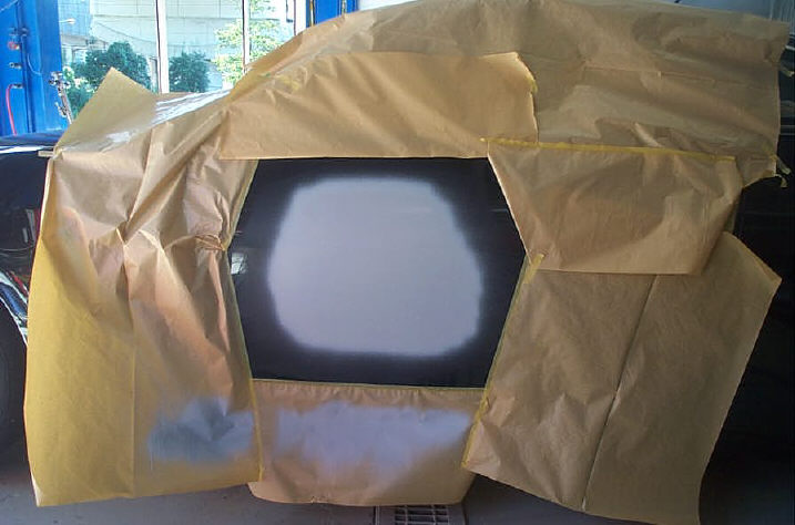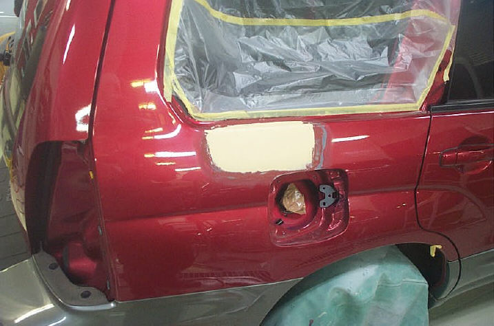そしてプライマー(レッドブラウン)の周りに露出した鋼板部分にウォッシュプライマー(デュポン820R)を塗布します。サフェーサーを塗る範囲内は#240〜#400のペーパー目に揃えて(所謂「ペーパー目」の起きない状態にして)、なだらかな傾斜(所謂「フェザーエッジ」)を作成します。フェザーエッジを丁寧に作成すればそれだけエッジマッピング(所謂「パテ痩せ」現象)が起こる可能性は低くなります。なのでこのような広範囲になってしまいます。これを小さく済まそうとすれば前記した「エッジマッピング」が起こりやすくなります。前回行なったフォレスターも、これを考えた結果サフェーサーの範囲が大きくなり、「ボカシ」の範囲が狭くなってしまい、隣接パネルの塗装が必要となりました。逆にこれらを小さく小さく収めようとすると問題が起こる可能性が高くなると考えられます。