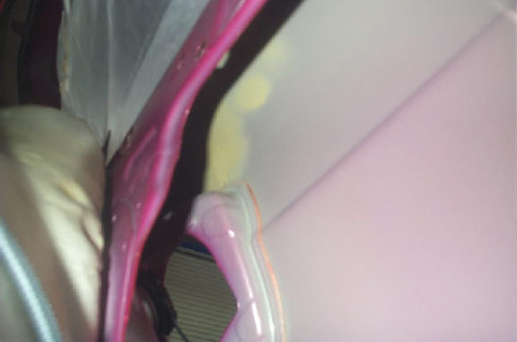 おもいっきりピンぼけしていますが、保険屋さんに提出する画像なので別に良いと思って適当に撮ってしまいました。フォレスターのクォーターパネル内部の画像です。 火(スタッド)は使っておりませんが、ドリー(表から鋼板をハンマリングする際に裏に当てて使う鉄の塊)を裏で叩いているので当然パネルの裏側は傷付いています。肉眼では確認出来ませんが恐らく鋼板が露出した個所もあると思います。なので裏側はウォッシュプライマー(デュポン820R)で防錆処理を施しておきます。火(スタッド又は溶接)を使った場合も勿論必要な事だと思います(言い切るのもどうかと思ってこんな言い回しになりましたが…)