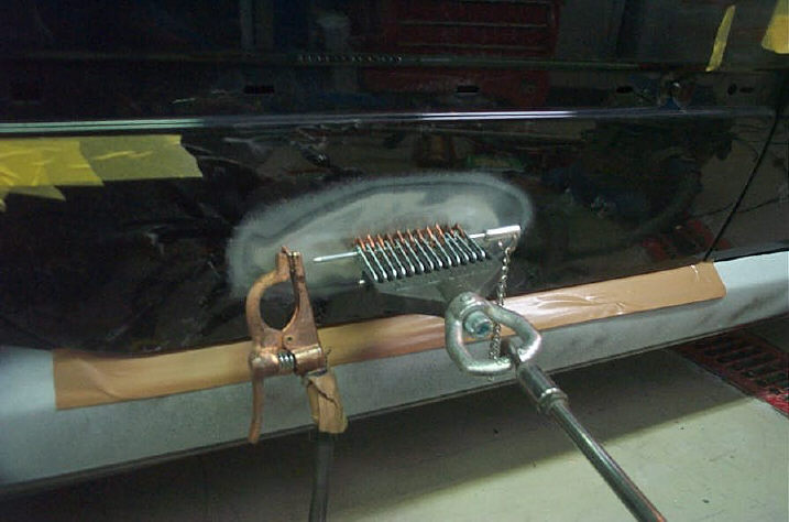 こちらが所謂「火」を使う作業の一つ、「スタッド」です。横方向線状に凹んだ個所に「ワッシャー」(厳密にはスタッド専用の物で五角形の頂点のあるタイプ)を電気的に溶接し、表からクランプを引っ掛けて引っ張り出します。厳密には「引っ張った状態で叩く」になります。凹んだ個所の周り(特に上下)は伸びた鉄の逃げ場が無くなって膨らんだ状態になっています。なのでクランプを適度な力で引っ張りながら、その周りを叩いてあげます。こちらも私が叩きました(厳密に言うと私は「塗装屋」であり、日常的に「板金作業」は致しませんので…)
