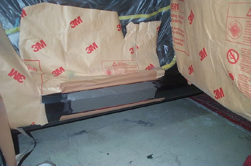 鋼板の叩きが終了し、プライマー(スタンドックスレッドブラウン)を塗布し強制乾燥(60℃20分)し研磨(#240足付け処理)、その後パテ(スタンドックスPEソフトストッパー)を塗布しました。露出した鋼板面はプライマーにより防錆処理が施されているので、本日はパテを塗って終了です。このまま放っておいても錆びる事はありません。