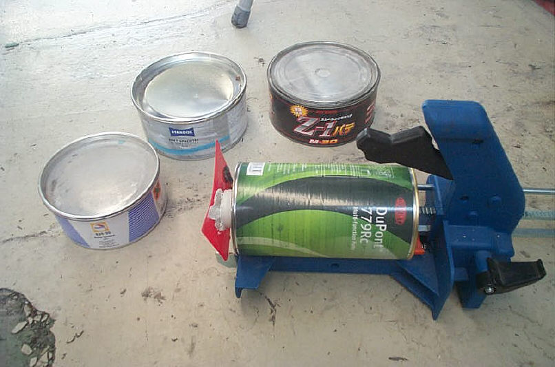 左から ・グラスリッド ポリエステルパテ ・スタンドックス ポリエステルパテ ・Z1パテ エポキシパテ 右下のディスペンサー(専用機械)に装着してあるのがデュポンのポリパテです。 グラスリッドのパテは亜鉛鋼板への食い付きが良くて評判との事です。知人の板金屋さん曰く、中身はRM社の物と同じらしいです。へら付け性も良くきめ細かくて好きです。前記したプジョー307はこちらです。 スタンドックスのポリパテはうちで最も使用頻度が高いですが、乾燥(硬化)が早過ぎるので気温の高い日は使い難いです。全体的にバランスは良く品質は勿論お気に入りです。 Z1パテは私的にパッケージのデザインが嫌いですが(極めて私的感覚です)性能は抜群です。作業性が悪くコストも高いのがネックですがそれも許せます。せめてパッケージデザインがもう少し格好良くなれば…ですね。 デュポンのパテは最近導入した物で、このディスペンサーい装着すればワンタッチで硬化剤と主材が適量出てくるので、わざわざ計量する手間が省けます。その他のパテは毎回秤で重量計測しています。「見た目の比率」だけで行なうと「ニジミ」や「硬化不良」の原因となるので危険です。