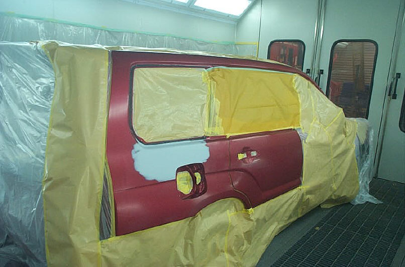 最初の予定ではクォーターパネルのみ(ルーフサイドパネル含む)の塗装でしたが、サフェーサーの塗布面積が予定よりも大きくなった為、クォーターパネル内ではベースコートのボカシ範囲が狭すぎると判断し、リヤドアの塗装に至りました。 ベースコートのボカシ際はどうしてもドライコートっぽくなりがちで(ベースコートの肌が荒れがちで)、この場合メタリック粒子が立ち気味になり、「表面が明るくスカシが黒い」状態になります。ボカシ範囲が広ければ、ボカシ際をずらしていけば気にする事でも無いのですが、狭い範囲だと同じ個所でボカシ際が発生し、ベースカラーの肌が荒れてしまい色味までが変わってしまいます。特に今回のような赤パール系の塗色は隠ぺい力が弱い為(染まり難い為)、コート数が多くなりがちでボカシ際のドライコートも起こり易くなります。