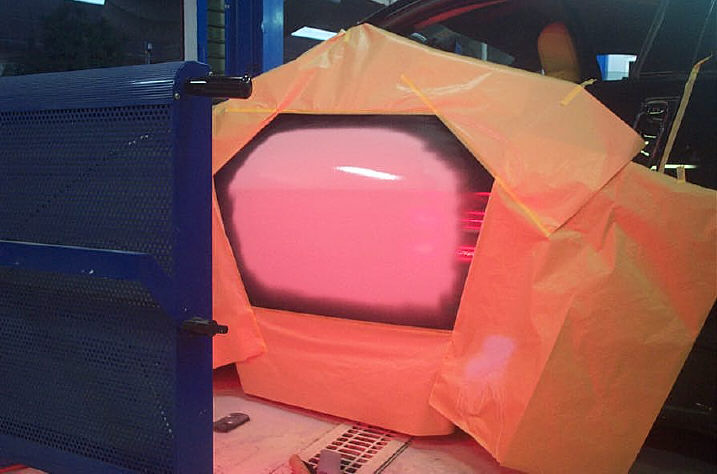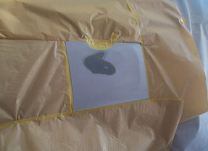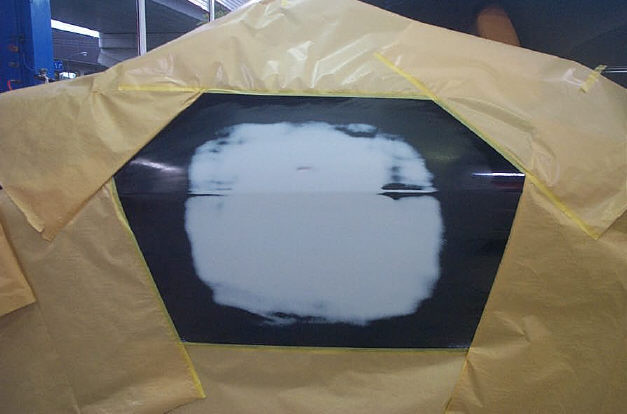 そして最後にプライマーサフェーサー(スタンドックスシステムフィラー)を3回程塗布して完了です。サフェーサーは各コート間でもきちんとフラッシュオフタイム(コート間の待ち時間)を置き、1コート毎の溶剤分を飛ばします。各フラッシュオフタイムは10分程で、プライマーサフェーサーを塗布する為の所要時間は20分〜30分くらい掛けて行います。その間は他の作業をしてたりします。温度の低い冬場は赤外線ヒーターを遠目に置いて被塗物を30℃くらいで保ったりします。この「コート間のフラッシュオフタイム」を面倒と思い、エアーブローで時間短縮させようとしてしまうとサフェーサーの表面だけが乾燥して蓋をしてしまい、サフェーサー内部から揮発しようとする溶剤分が抜けられなくなる「溶剤篭り」が発生します。最悪の結果、数センチ程のブリスターが発生したりもします。それであればその場で問題を発見出来ますが、ブリスター化しない溶剤篭り(通常はこれが一般的)を起こすと、本塗り後や納車後に「艶引け」や「ペーパー目」なる問題を発生します。