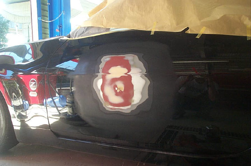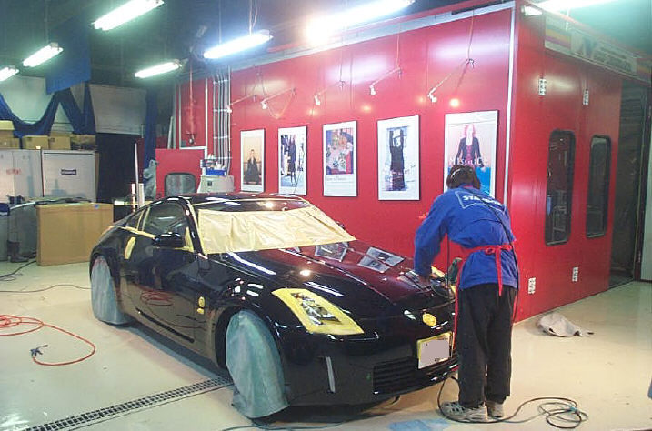 こちらのZ、車体色はソリッドの黒ですが、国産車には珍しく「2コートソリッド」の新車塗膜になります。なので補修方法もそれにならっての2コート仕上げとなります。