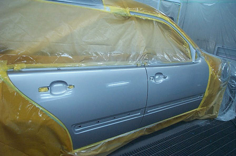 今回はベースコートのボカシ範囲的には15センチくらいの幅があった為、強行しても(ドアのボカシをしなくても)問題無かったかも知れませんが、もしそれで失敗(パネル間の色違い)が生じた場合は最悪の結果となります。後からリヤドアのみ塗装しても、ドライコート状態になったクォーターパネルのボカシ際と色味を同じにするのは難しくなります。同じようにドライコートでベースコートの肌を荒らした状態を再現しなければなりません。それを避ける場合は、再度クォーターパネルも含めた2パネルを塗り直す結果となります。 なので手間は増えますが、リスク分を極力する無くする為リヤドアも同時に塗装を行ないました。結果としては良かったと思いますし、自分的には殆どの場合今回と同じ事を行ないますのでこれを日常的な作業で「手間」と考える事も少ないとは思います。