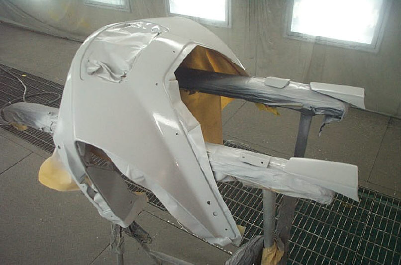 以前、スカイライン(R34)のドライカーボン製のドアを「見た目純正と同じ様に」とのご依頼を請けた事がありますが、純正の鋼板パネルと違いFRPに良くある全体的な歪みが発生し美しく無いラインになっていましたが、サフェーサーの3度打ちで何とかこれに対応しました。ライン出しは難しく苦しい作業ではありますが、スジ一つ無いラインが出た時にはあり得ない位の達成感が得られる事でもあります。なので下地処理は工程の中でも結構好きだったりします。