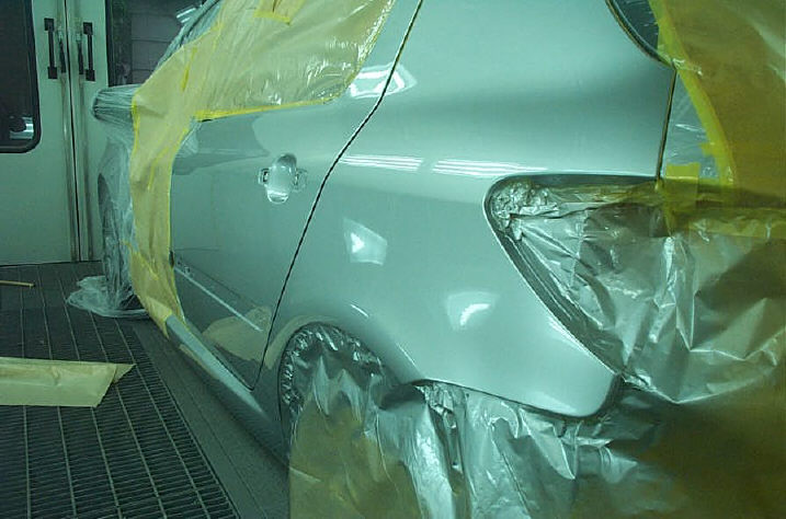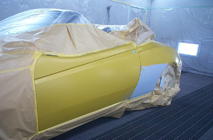 外板パネルと、ドアを開けた内側の部位の塗装をわざわざ分けて塗るには勿論意味があります。内側を一緒に塗る場合、ドアを完全に閉められなくなるのでクォーターパネルとドアとの肌違いが生じる恐れがあります。またゴミの付き方も非常に変わってきます。また先に内側を塗るよりも、後から内側を塗る方が「クリアーの切れ目」での仕上がりが全然良くなりますし、何より外側を塗る時にスプレーガンの方向などに気を使わなくて良いので(連続パネルの塗装では結構気を使う所です)外板パネルの塗装により集中して作業出来ます。二度手間にはなりますが、何より仕上がり重視での結果、このような作業になります。