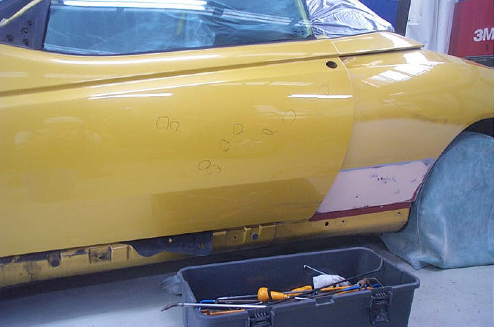 損傷箇所は左クォーター下部で、結構凹んでいます…。 鈑金担当は前記に登場した「ゴトー氏」になります。まだ自分の会社が暇なんだそうで(腕が悪いわけで仕事が無い訳ではありませんのでご安心下さい)またまた手伝いに来て頂きました。非常に助かります(現在こちらでは大きな塗装を抱えているので…。ちなみに業者さんからのお仕事なので紹介は出来ませんが…)