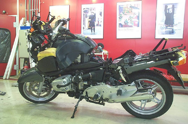 その他の作業では、BMW RT1150は各部傷の修正が終わり、サフェーサーの塗布が完了し、現在乾燥中になります。