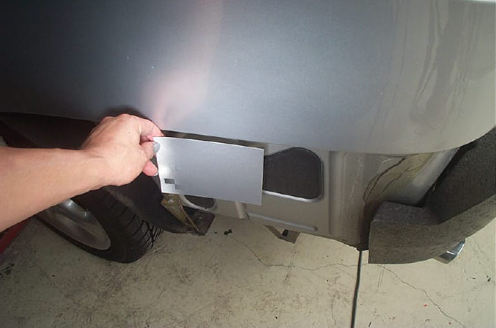 ポロはリヤバンパーの左角のみのスポット塗装「クイックスポット」での修理になります。 調色作業をしていて解った事は、クォーターパネル(右)とリヤバンパーで大きく色が違います…。そんなに違和感は無かったのですが…。ちなみに右クォーターは塗装暦アリです。 今回のクイックスポットではバンパーの部分的な塗装なので、比色はバンパーで行います。画像に写っているテストピースの色は既存カラーデータで作成した塗色です。どちらかと言うとボディよりの色味です。これをバンパーの塗色に合わせていきます。