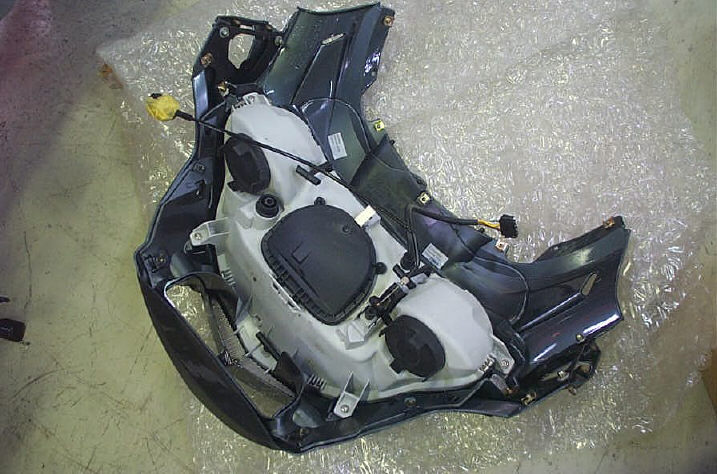 今回のご依頼では、アッパーカウルやサイドカウル等の傷修理&塗装です。 当初は車体を購入したディーラーさんで修理する予定で、見積もりを出して貰った所、非常に高い見積もりが提示されたとの事で、当店に御来店頂きました。私もその見積書見せて頂きましたが、正直なところ作業する立場からすると非常に羨ましい金額でした…。が、プロフィット本業は4輪自動車の車体修理業で、「二輪車は場所を取らないので手の空いた時に行う」なんて趣味的なところもあるので、納期は非常に長めに頂く代わりに見積もりは4輪車に比べ比較的安めにする事にしています。が、アッパーカウル脱着で3万数千円(正確な値忘れました…)近く頂けるのであれば自社ビルが建ちそうですね…ヨダレが出そうです。