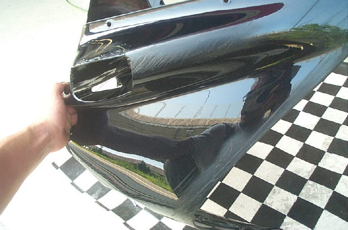 樹脂素地の細かい凸凹(シボ模様)を削り落とし、サフェーサーの塗布&研磨によって作った平滑な下地により、ボディと同様艶々に仕上げる事が出来ます。元の状態がどんな感じだったか解らない仕上がりになっております。美しいです。