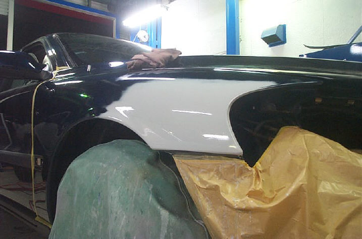 今回損傷を受けたフロントフェンダー部分はRラインが複合する複雑な3次元的なライン部の為、何度もラインを確認しながら慎重に研摩を行います。 横からスカシて見るだけでは2次元的なラインしか見えないので、複雑なラインの確認にはその部位にシリコンオフをスプレーし、サフェーサー部を艶々にする事によって背景の写り込みを良くしてラインの確認を念入りに行います。自分的にはこの「微妙な面出し」が好きです。特に難しい逆アールの複合的なラインは形成が難しい分、綺麗に出来た時の満足感は高いです(作業者が満足しても仕方無いのですが…)